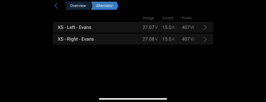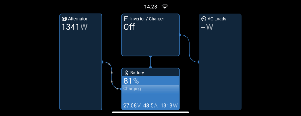 For example, on my phone over Wi-Fi I can set maximum charge current in a single setting, which controls both Orion XS units as we are driving down the road. Suppose it’s hot out and you want to back off on charge current. If you set maximum charge current to 30A, both units instantly back off to 15A each.