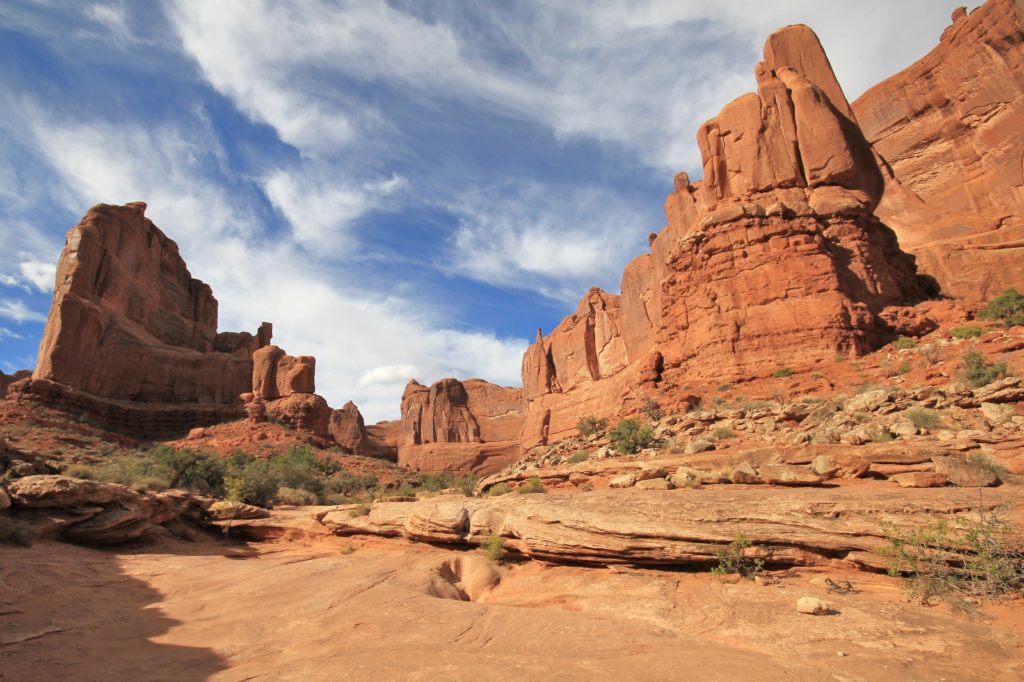 Driving into Arches, Park Avenue & Courthouse Towers is the first major stop. Here you can enjoy the viewpoint or take a 2.0 miles out and back hike. The trail descends into a spectacular canyon where red cliffs tower on both sides. The end of the trail provides excellent views of Courthouse Towers including Three Gossips, Sheep Rock, Organ, and Tower of Babel rock formations. Most people don’t go past the viewpoint making this a nice trail for those who like a quieter park experience. This trail has 320′ of elevation change and is rated as moderate.